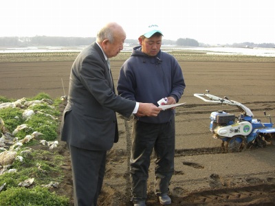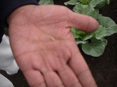 | 無農薬でキャベツを作れる事を説明する秋葉代表 4回経験者 | キャベツの苗が植えられた2008年 4月 2アール1000株 | |||||